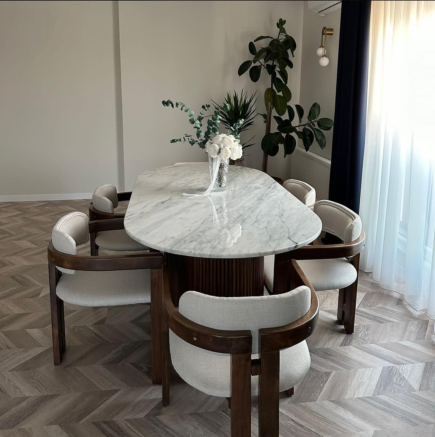 Ovalia; davetkâr oval formu, doğal damar geçişli mermer tablası ve sağlam orta ayak tasarımıyla mekâna sakin bir güç katar. Minimal hatları sayesinde pek çok dekor tarzıyla uyum sağlar; gündelik sofralardan özel davetlere kadar her anı yükseltir. Doğal taşın kalıcılığı, ahşap dokunun sıcaklığıyla birleşir ve uzun yıllar kullanım için dengeli, konforlu bir merkez oluşturur. (Bakım önerisi: Asitli/aşındırıcı temizleyicilerden kaçının; nemli yumuşak bir bezle silin, lekelere karşı bardak altlığı kullanın.)